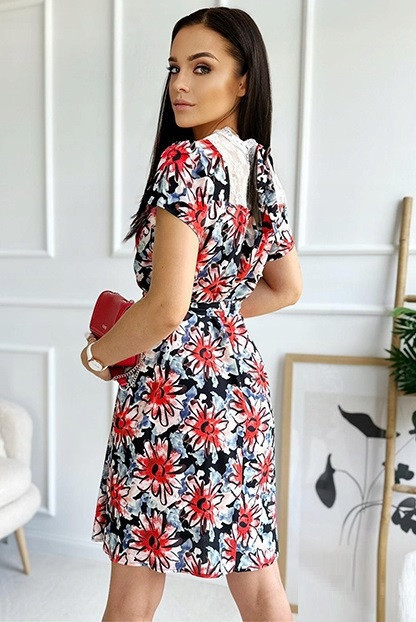 Elegáns piros alapon virágos fodros miniruha