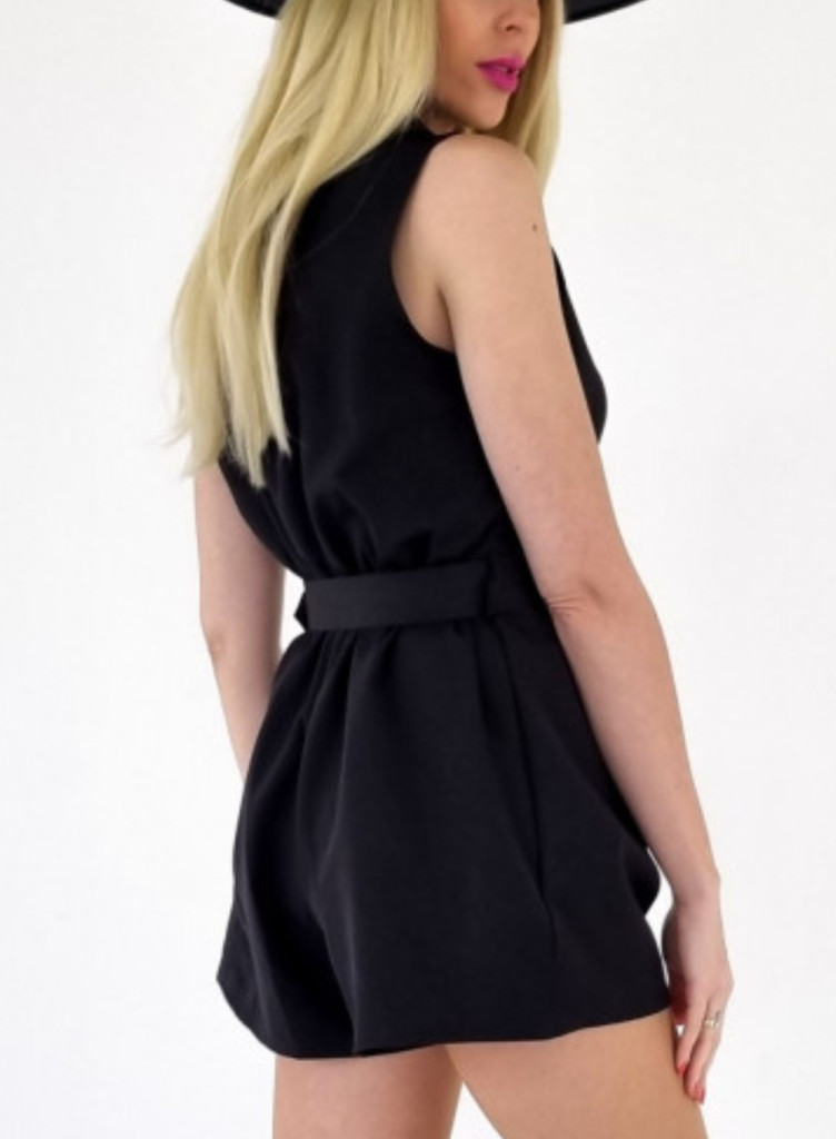 Elegáns ujjatlan fekete galléros short overál övvel