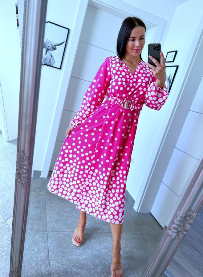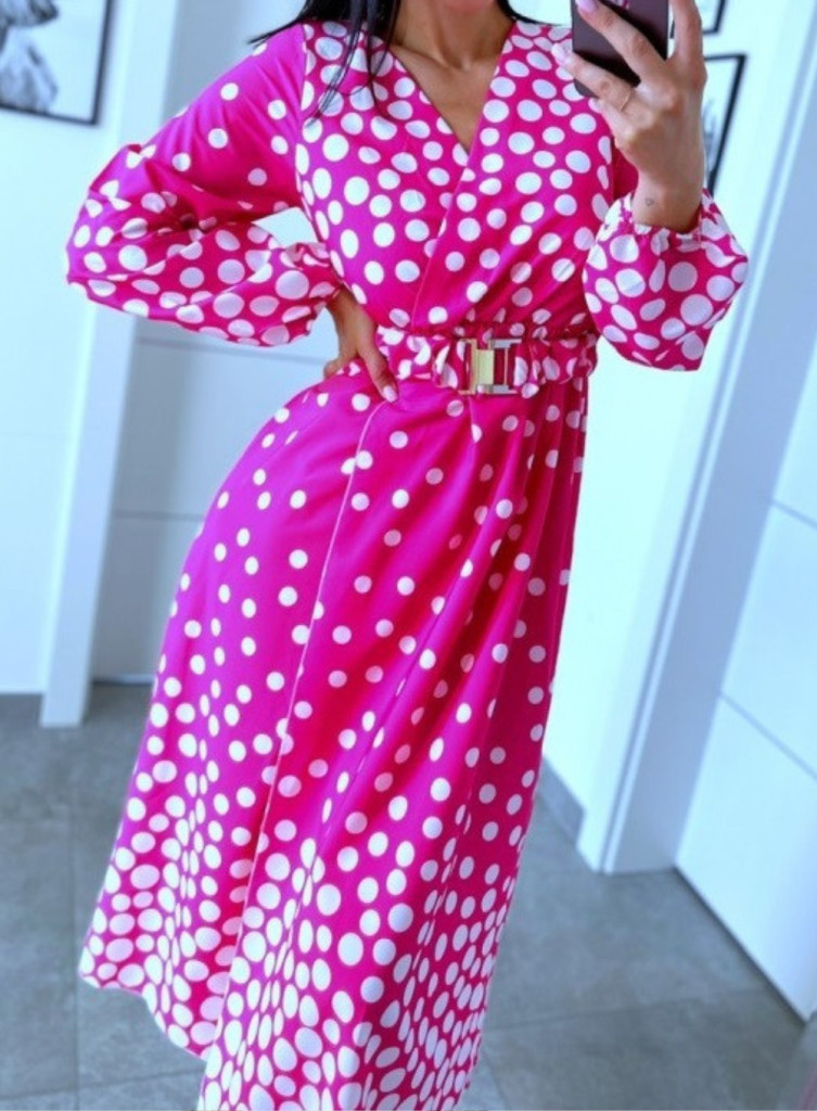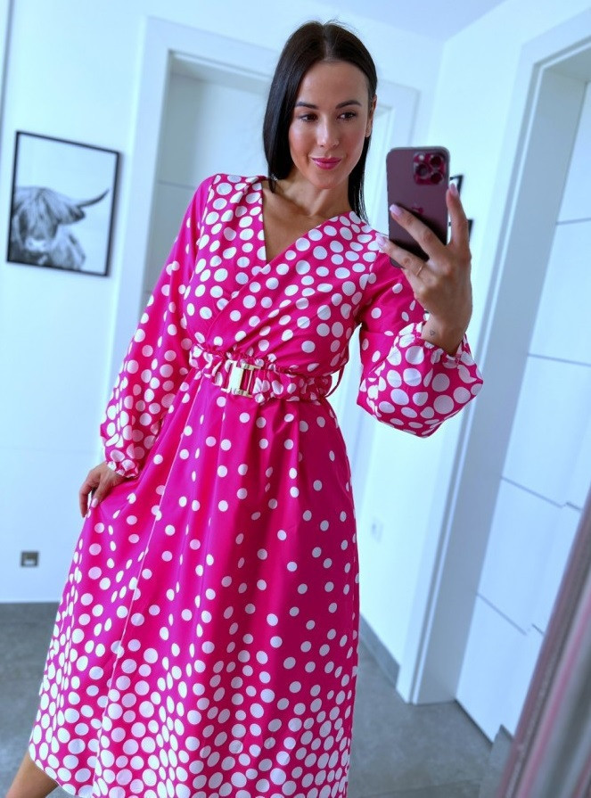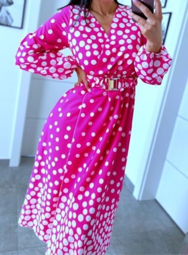 Gyönyörű pink hidegselyem pöttyös maxiruha övvel