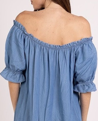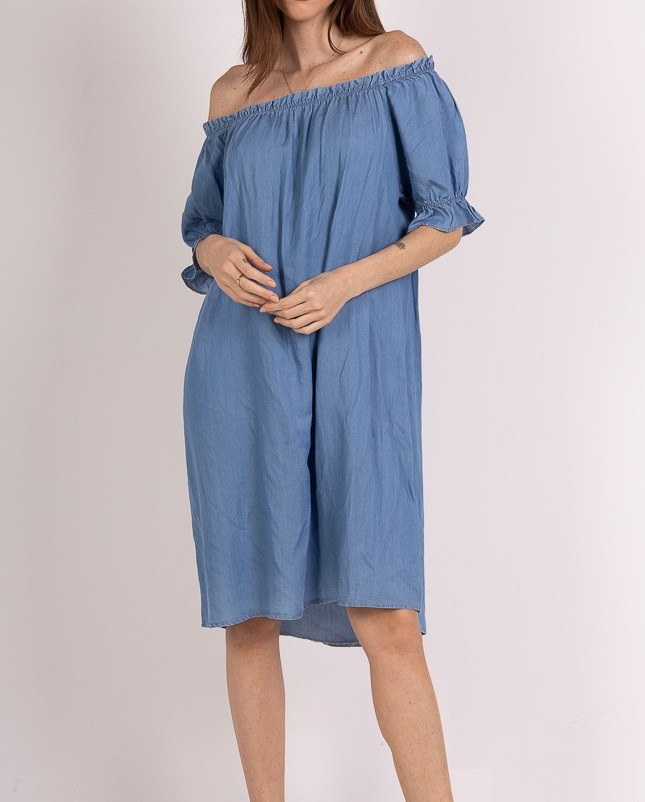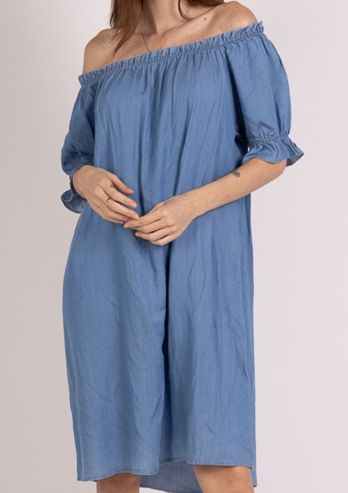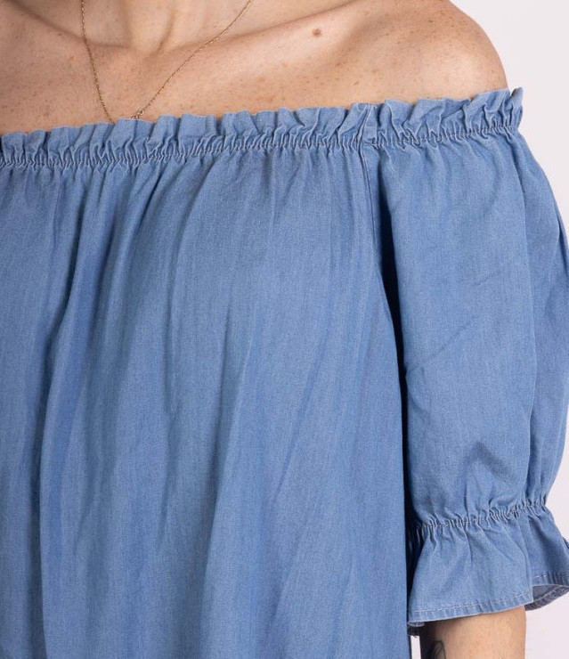 Plus size ejtett vállú ujján fodros lenge (kismama) farmer ruha