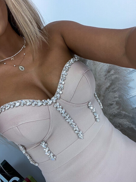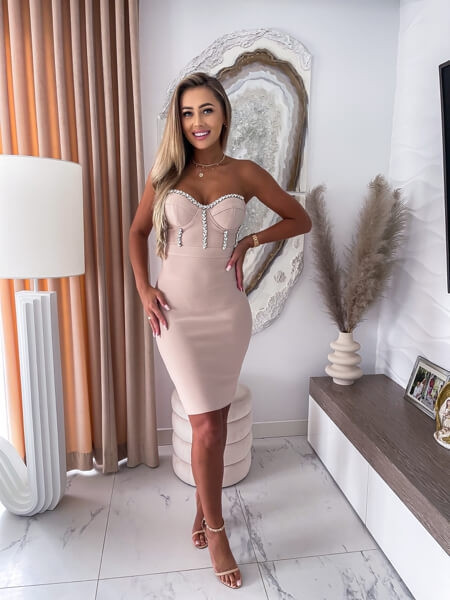 Exkluzív köves bézs testhezálló alakformáló midiruha szivacsos mellrésszel