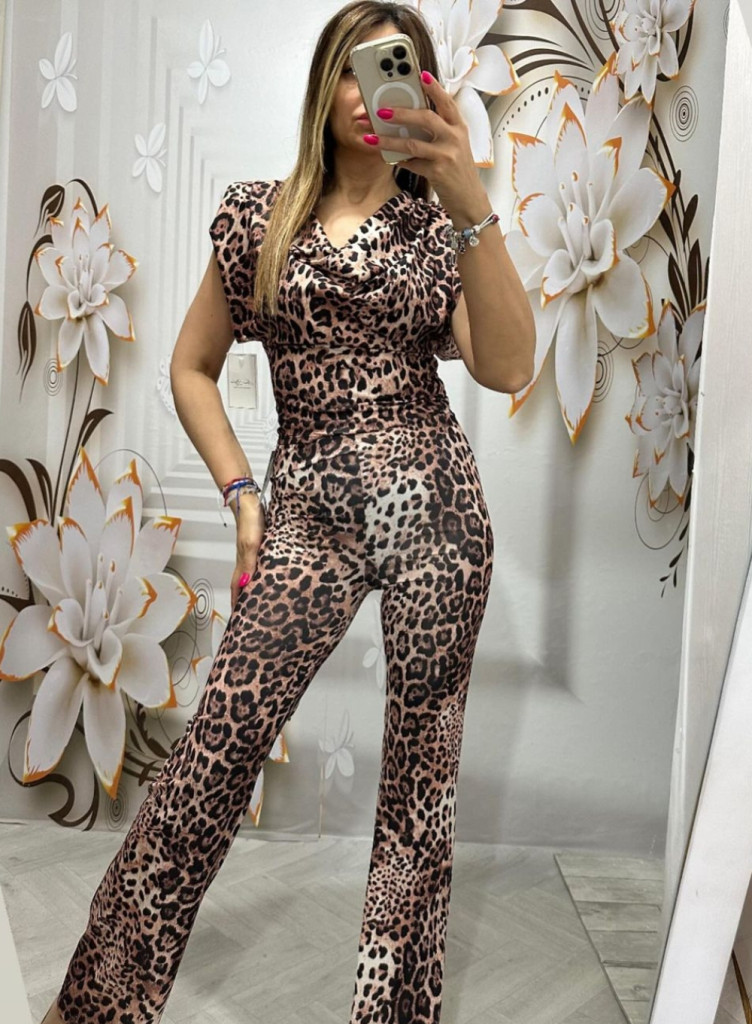 Kámzsa nyakú elegáns leopárd mintás ujjatlan overál válltöméssel
