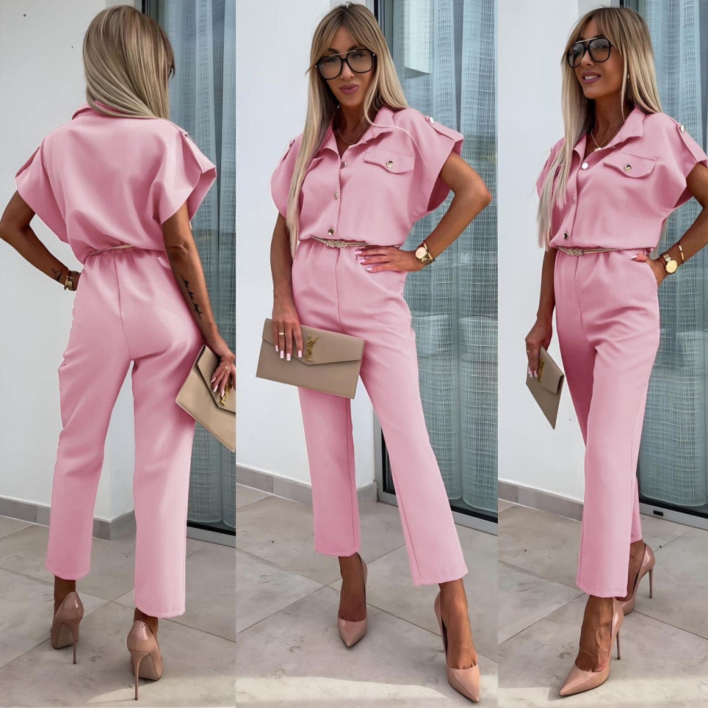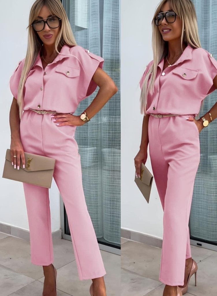 Sportosan elegáns rövid ujjú overál arany gombokkal és övvel