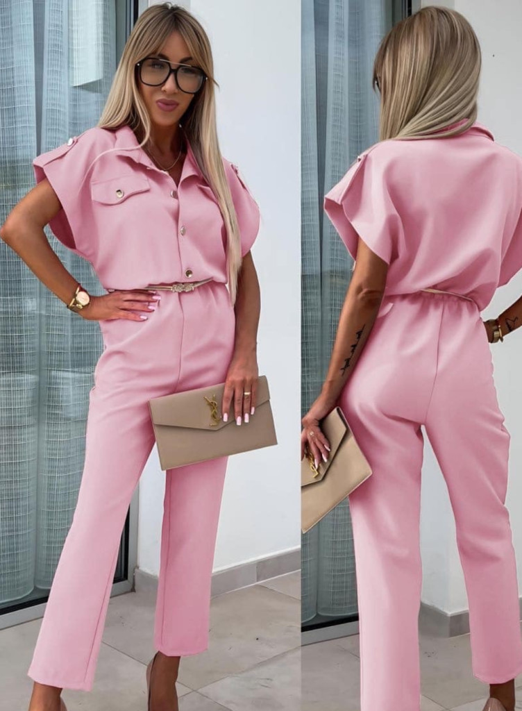 Ezt a sportosan elegáns overált az arany gombjai és öve teszik jellegzetessé, ezért felkelti mindenki figyelmét. Univerzális ruhadarab, párosíthatod különféle kiegészítőkkel, így érdekes kombinációkat hozhatsz létre. A bemutatott modell elegáns gallérral és szélesebb, rövid ujjú dekoratív mandzsettával rendelkezik. Zsebeket imitáló fülekkel rendelkezik, és arany színű gombokkal van rögzítve. Az hozzátartozó elasztikus övnek köszönhetően pedig kihangsúlyozhatod benne a derekadat. A lábak finoman elkeskenyednek lefelé, és gyönyörűen bemutatják a lábát magassarkúval és szandálokkal egyaránt.